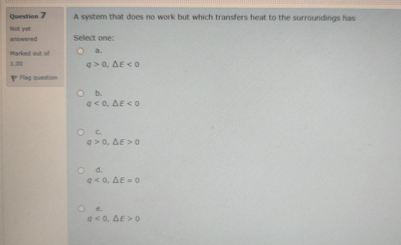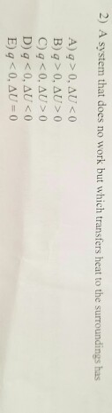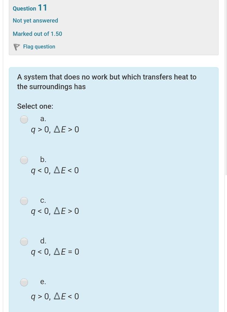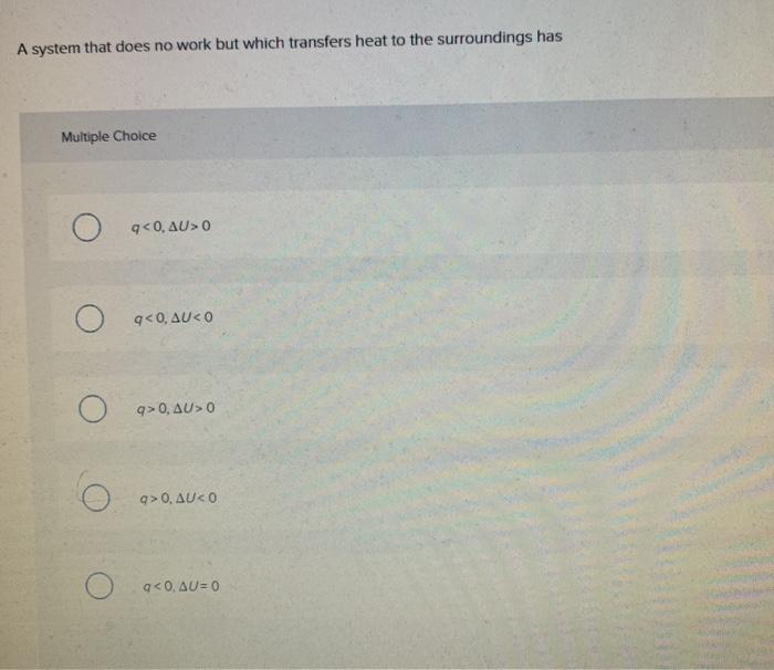 Asked Sep 2 2019 in Chemistry by Chase. 3 Changing the State of a System with Heat and Work. E q 0 E 0C q 0 E 0. D q 0 DE 0. C q 0 DE 0. A system that does no work but which transfers heat to the surroundings has. W 0 ΔU 0 C. Internal energy of a thermodynamic system is its total mechanical energy. Chemistry questions and answers.